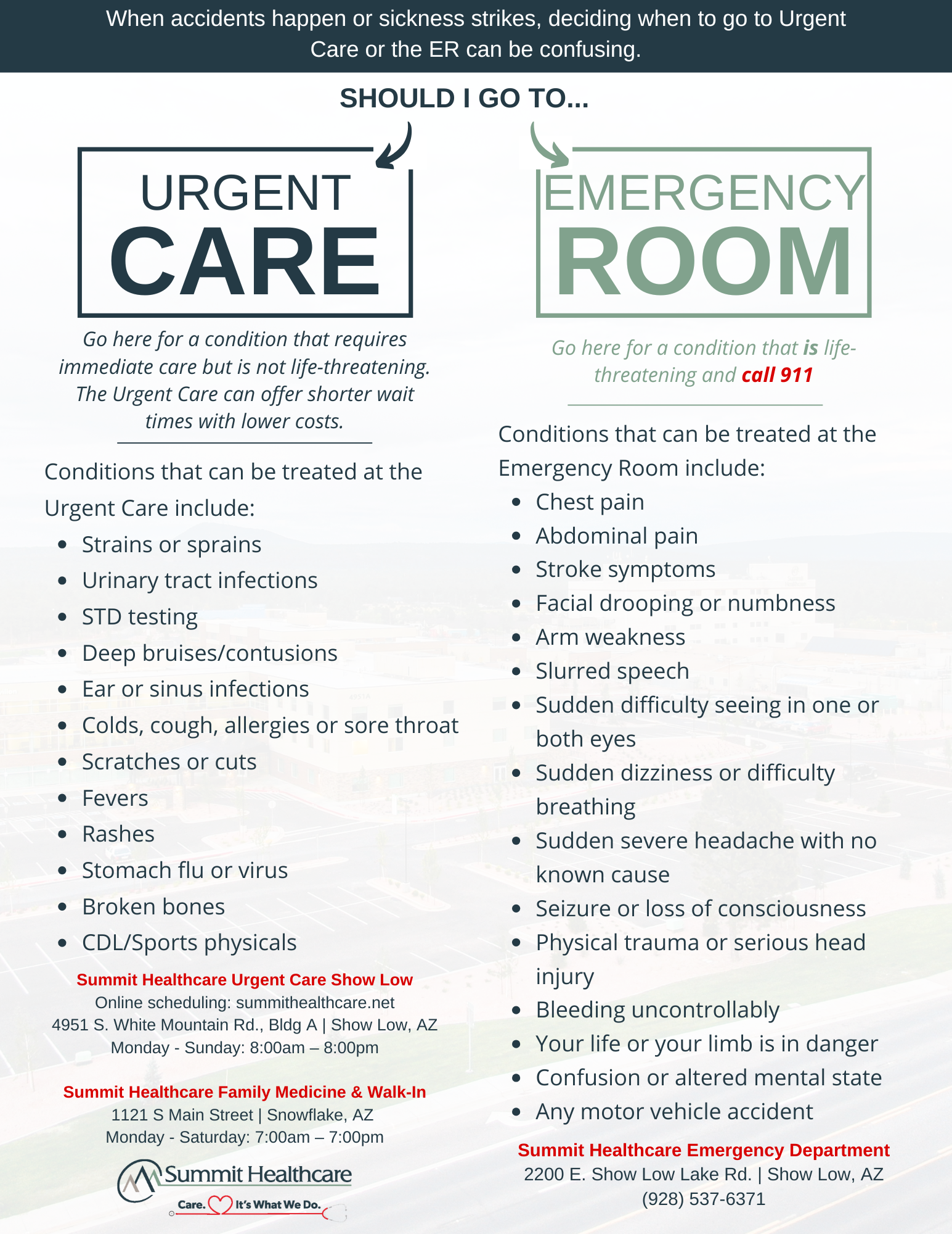 Know where to turn in an emergency. Summit Healthcare is here, close to home, 24/7, with advanced stroke, trauma, and pediatric emergency care.